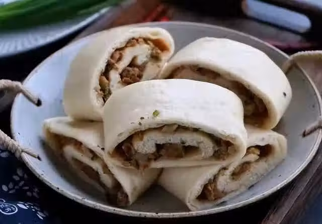 醒好的麵糰放在案板上揉勻排氣,擀成大片,抹上肉餡兒攤開,捲起來,直接放入蒸籠,進行二次醒發,有明顯變大,大火上汽蒸15分鐘,出鍋改刀切段,即可裝盤食用。