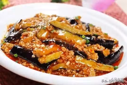 3.起鍋燒油,下入肉末炒散焯熟,炒至干香,下入蔥姜蒜末、豆瓣醬(剁碎剁細)、泡椒末,炒香炒出紅油,摻少許鮮湯或水也可把這部省略,燒開,調入料酒、醬油、味精,下入茄子炒勻,淋入料汁,略收濃湯汁,撒上蔥花出鍋裝盤即可。