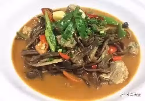 2.將發好的鹿茸菌擠干水分,鍋內倒入豬油燒熱,下入鹿茸菌煸炒。加入青紅椒、大蒜子、辣妹子,煸炒後倒入煨好的排骨。加高湯一起收汁即可。