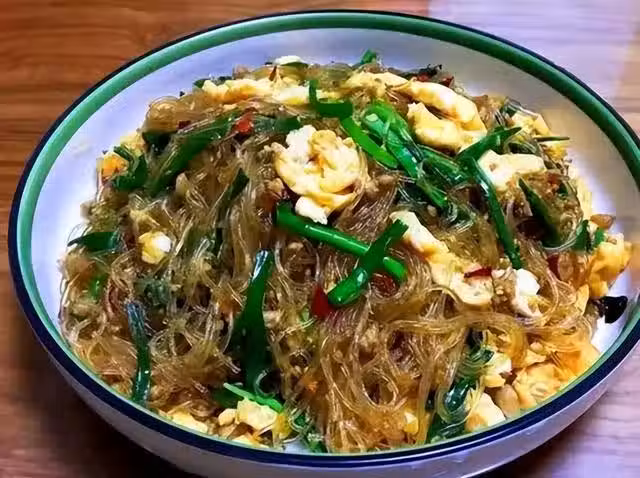 3.再起鍋燒油,下入干辣椒、蔥段、薑片爆香,下入粉條炒香,調入醬油上色,加入鹽、味精、胡椒粉翻炒入味,下入韭菜段和炒熟的雞蛋,快速翻炒均勻,淋入少許香油,即可出鍋裝盤。