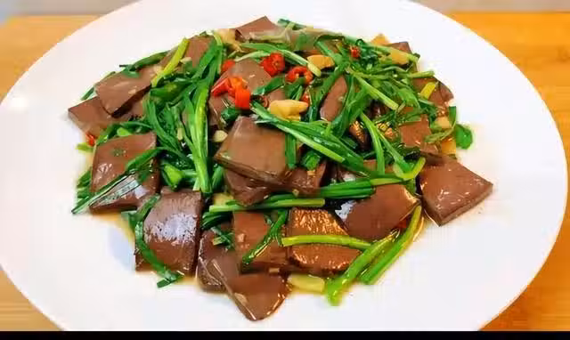 2.起鍋燒油,下入蔥姜蒜片爆香,下入豬血翻炒均勻,淋入少許清水,調入鹽、生抽、味精炒勻,下入韭菜翻炒斷生,淋少許水澱粉,炒勻出鍋裝盤即可。