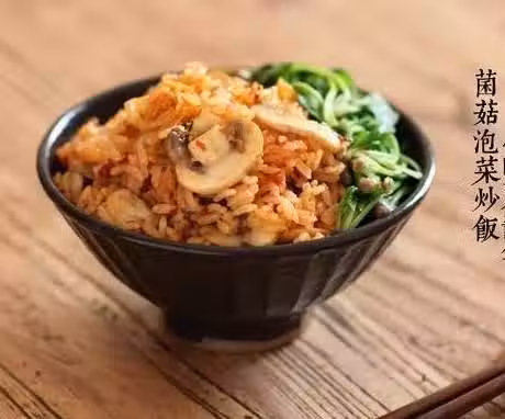 2、鍋燒熱下油,下蘑菇片炒至微微出水,然後下辣白菜炒出香味,加入拌鬆了的米飯炒均勻(嘗味調整鹹淡)出鍋裝盤,把小菠菜擺一旁即可。