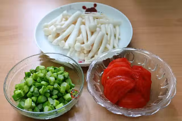 1、海鮮菇洗凈對半切段,番茄洗凈,去皮切片,用去皮刀刨去菜心表皮,洗凈切粒(我家小妞不吃蘆筍,所以換成芥藍芯,也可以用甜豆或秋葵又或是豆角、西藍花都可以,是綠色菜梗就行)