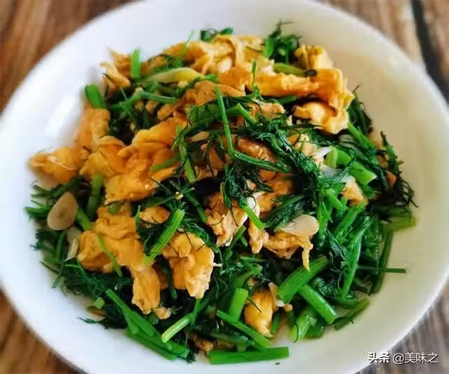 7、放入茴香翻炒加入少許精鹽,生抽烹一下,最後再將雞蛋花放入翻拌幾下即可出鍋。