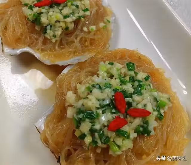 8、把攪拌均勻的粉絲鋪在扇貝肉上,