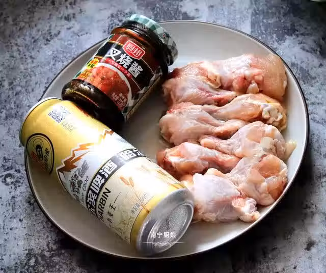 準備好食材:雞翅根8根、啤酒1罐、叉燒醬1勺、老抽1勺、生抽1勺、蚝油1勺、白糖半勺、食鹽勺、蜂蜜1勺、生粉2勺