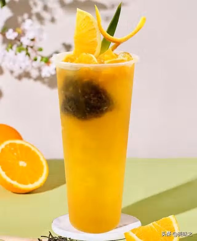 蒲公英草本三角茶包1個、熱開水250ml、柳橙汁15ml、橙子片適量、冰塊適量、冰糖糖漿20ml。