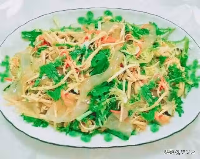 干豆腐拉皮拌苦菊的做法步驟:6 6擺一下盤,把炒肉菜放在中間,然後加點香油糖,醋,鹽,攪拌均勻就可以了。
