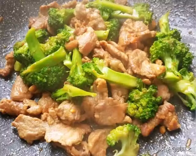 3、西藍花切小朵,放入淡鹽水中浸泡後撈出瀝水,倒入鍋中和瘦肉一起翻炒。