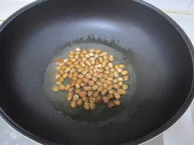3、冷鍋冷油,把花生米倒入,等油溫升高了,花生米也剛好炸香,切記,冷鍋冷油哦,炸香花生米撈起 ,即可。