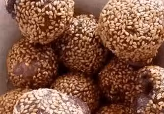 2、將和好的麵糰,掐成均勻的小劑子,搓成圓形後放到芝麻里滾一下,直到沾滿芝麻為止