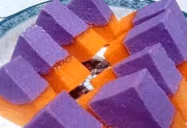 材料:木瓜、紫薯、白糖、牛奶、吉利丁片
