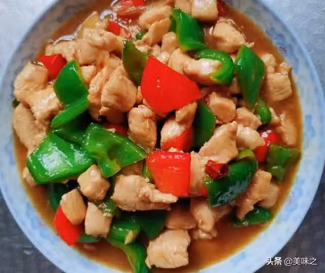 雞胸肉2塊、青椒1個、紅椒半個、蔥少許、姜3片、蒜3瓣、干辣椒3個、玉米澱粉2勺、色拉油適量、料酒1勺、生抽2勺、白鬍椒粉少許、鹽適量、雞精少許、蚝油1勺、白糖1勺、陳醋1勺。