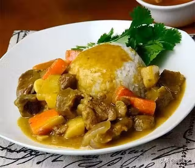 10、蒸好的米飯裝盤,澆上咖喱牛肉菜即可。