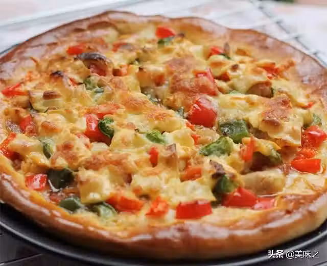 14、出爐了,烤好的披薩表面富有光澤;氣味鮮香誘人,飽滿的雞肉的鮮香味,令人垂涎三盡。