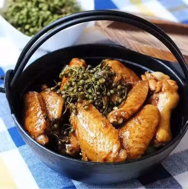 2、蔥姜切絲,鮮花椒洗凈,雞翅加入鹽、少許白酒,攪拌均勻腌制20分鐘;