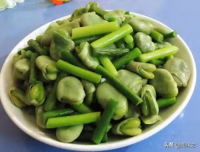 蠶豆1110克、蒜薹135克、鹽適量、白糖適量。