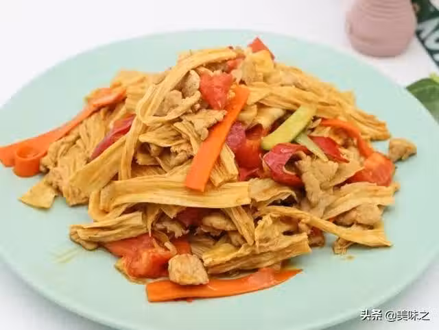 腐竹適量、胡蘿蔔適量、紅椒一個、肉絲適量、生薑適量、黃瓜幾片、大蒜適量、玉米澱粉一勺、玉米油10毫升、鹽1克、白糖1克、生抽2毫升。