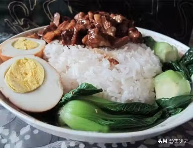 9、盛一碗米飯,將青菜、雞蛋和滷肉澆在上面即可。