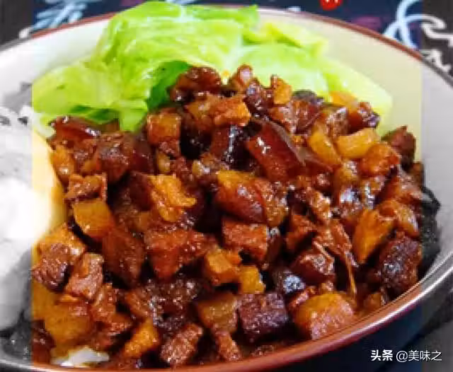 7、最後,盛米飯,澆滷肉汁,加上滷豆腐,配上一兩棵青菜心或者其它爽口小菜.旁若無人的扒飯連同肉和汁一起入口。