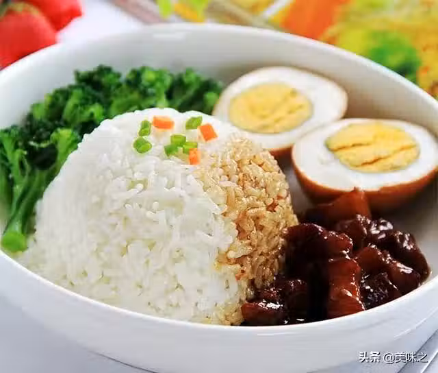 9、取一小碗把飯盛滿,壓實,倒扣在盤中,舀入滷肉,放入切好的雞蛋,擺入焯好的西蘭花,用蔥花胡蘿蔔料裝飾即可。