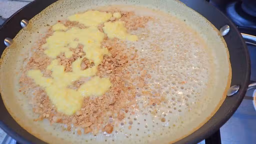 3. 用中小火燒熱不沾鍋,不能加入油,然後拿一勺麵糊倒入鍋中推開成圓形,看到表面上有小洞洞的時候就可以抹上少許牛油,撒入砂糖,花生碎和罐頭玉蜀黍泥。
