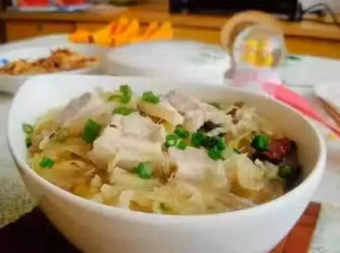 酸菜100g、五花肉100g、粉條200g、幹辣椒20g、蔥適量、鹽1勺、雞精0.25勺。