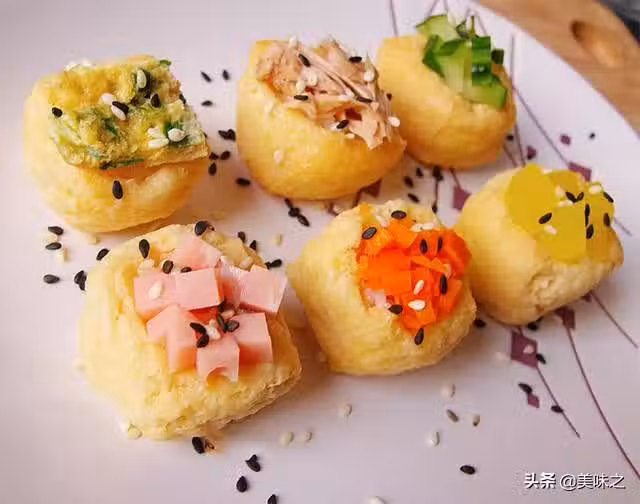 米飯500g、油豆腐100g、金槍魚罐頭適量、腌蘿蔔適量、胡蘿蔔適量、雞蛋適量、青瓜適量、火腿適量、鹽適量、醬油適量、醋適量、糖適量、雞精適量。