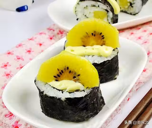 米飯適量、金艷果獼猴桃適量、丘比沙拉醬適量、壽司紫菜適量。