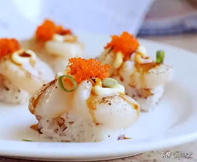 4、切好的鮮貝從中間打開,鋪在飯糰上,全部鋪好。