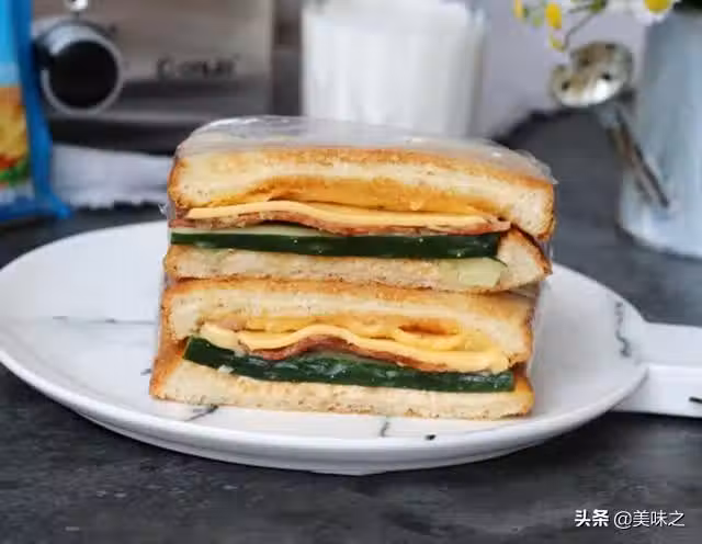 8、為了方便孩子吃的時候拿,用保鮮膜把三明治包緊,從三明治的中間切開就可以了。