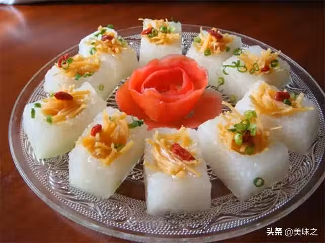 8、將芡汁淋上擺好盤的冬瓜上,用西紅柿皮做一朵紅玫瑰擺在中間做點綴表面再灑些香蔥即可。