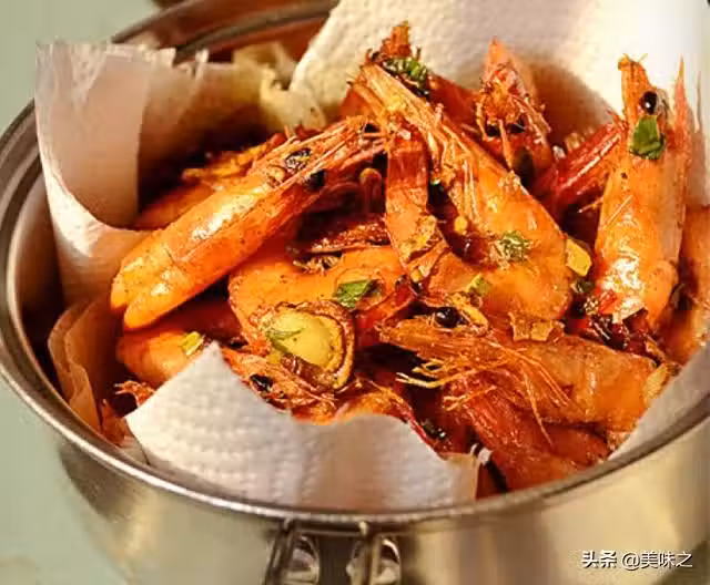 7、將蝦炸至金黃色時撈起瀝干油份(蝦殼變得酥脆)。