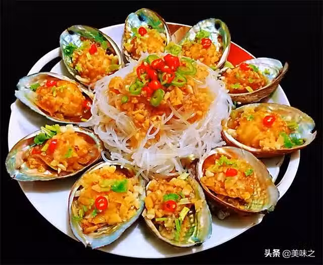 鮑魚10個、粉絲50克、蒜2頭、香菜5克、青紅辣椒10克、蚝油2勺、一品鮮醬油1勺。