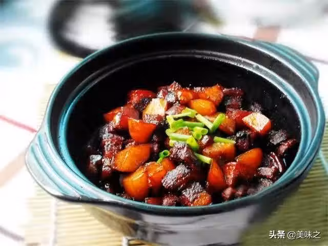 8、移至砂鍋中撇去浮沫,調入紅燒醬油;轉小火蓋上蓋子慢燉40分鐘,燉至五花肉軟糯;