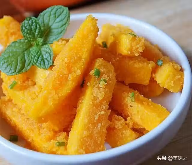 2、南瓜條、鹹蛋黃同入沸水蒸鍋蒸10-15分鐘,蒸至熟透,取出晾涼。