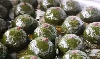 8、全部包好後,給每一個艾粄墊上一片葉子