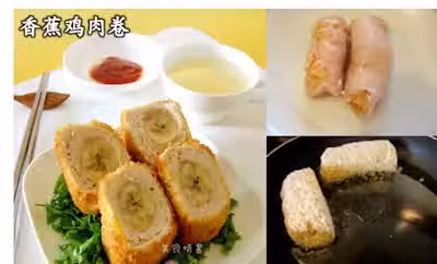 2. 取1段香蕉,用雞肉片包裹,裹上麵粉,蛋液,麵包糠。