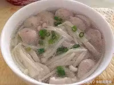 食材:豬瘦肉150克、金針菇250克、豆腐1塊、姜3片、白鬍椒粉、蔥花兒