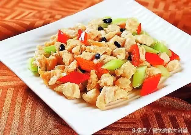 2.鍋加油燒四成熱放雞丁滑炒變色撈出,等油燒熱,放青紅辣椒和洋蔥、黑豆一起下油鍋過油10秒鐘立即撈出