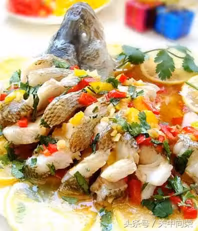 500g鱸魚、1個黃椒、1個紅椒、1個檸檬、適量油、適量鹽、適量香菜、適量蔥末、適量六月鮮醬油、適量醋、適量料酒、適量薑末