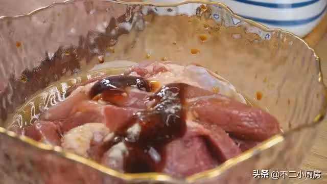2、下面來調味,加入一勺食用鹽調味,來點胡椒粉給它去腥,再來上生抽醬油,來一點點的蚝油,倒一些蔥、姜、水、蔥、姜、水能起到去腥增香作用,同時肉吸滿了汁水才會更加的滑嫩,給他用手多抓,一會,讓肉充分把這個調料的味道吸收掉,腌制上15分鐘。