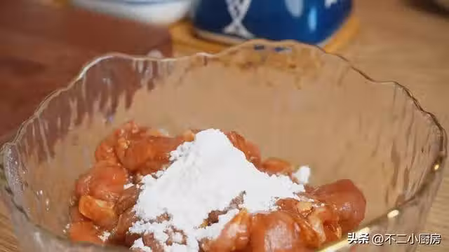 3、然後加入少許的玉米澱粉,用手給它抓拌均勻,要讓每一片肉都裹上澱粉,接著加入少許的食用油,鎖住肉的味道,抓勻以後給它腌制上15分鐘。