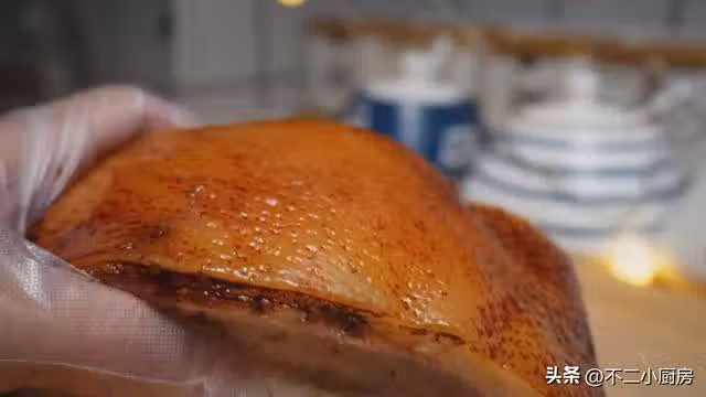 3、時間到了以後我們把蓋子打開,接著用夾子把五花肉夾到案板上晾一下溫度,然後把五花肉給它翻個面,讓皮朝上找一個牙籤給它扎一下小孔,方便入味,一定要多扎一些入味,更加均勻,然後在豬皮上倒入老抽,適當的多倒一些,接著用用手給它塗抹一下,把豬皮上都均勻的塗上老抽,像這個樣子就可以了。