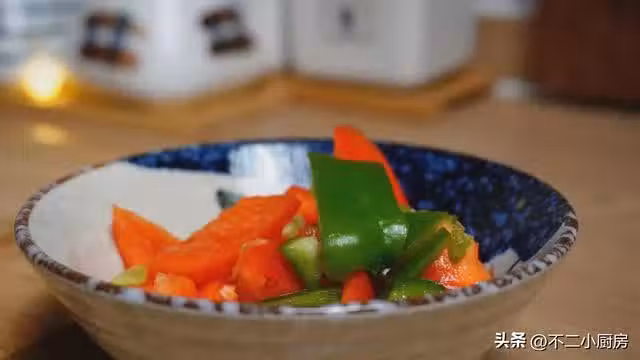 3、我們再準備點青紅椒,首先切成長條,然後再切成小碎丁,切好之後我們放入到碗中,準備點小蔥切成長一點的段,切好之後放入到碗中,準備一小塊姜,切成薑片,切好之後放入到碗中。
