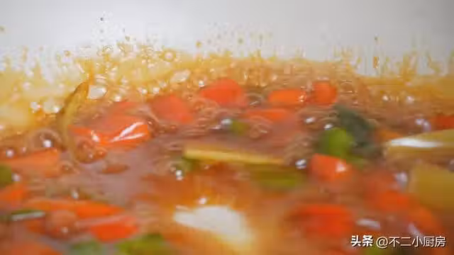 8、然後把我們的料汁加進來,用鏟子快速的不停的攪拌,一直把湯汁炒到這種粘稠的狀態,微微可以掛上鏟子,像這個樣子就可以了。
