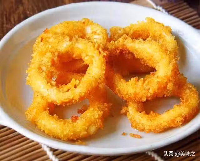 4、油溫燒至6、7成熱,放入魷魚圈轉中小火炸至金黃色即可。
