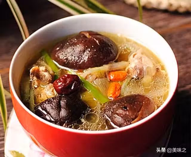 6、將香菇和大棗、枸杞放進去,加一點料酒,大火燒開後改小火燉20分鐘,關火後加一點食鹽即可。