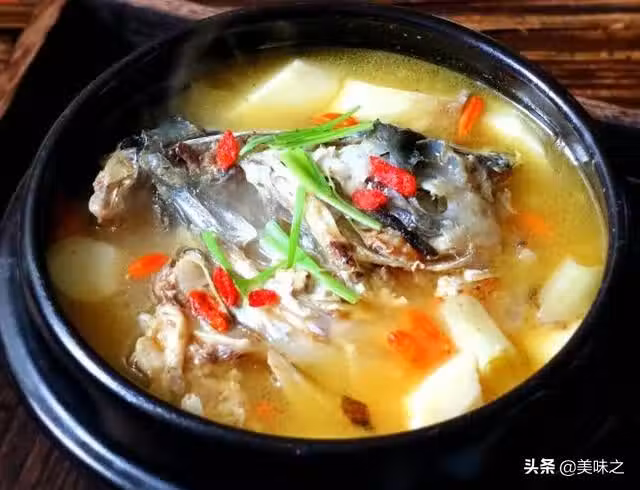 魚頭1個、山藥1根、枸杞適量、泡椒1個、泡蘿蔔半個、薑片適量、大蔥適量、料酒適量。