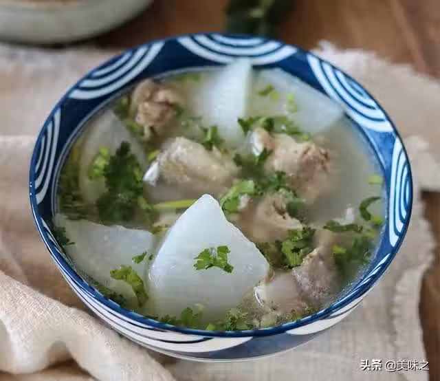 6、煮鍋中放入煮好的牛骨湯,放入白蘿蔔和鹽,煮到蘿蔔透明熟透即可。吃時可加點香菜。